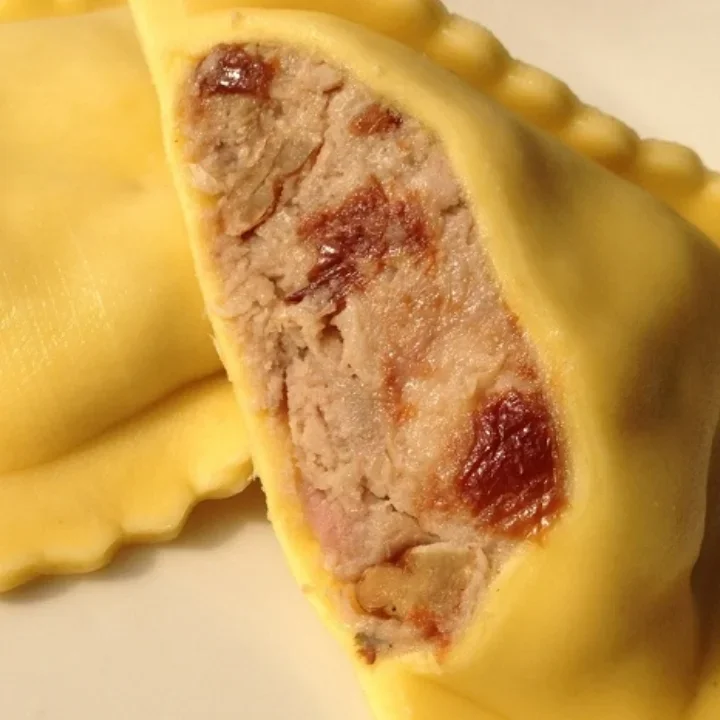 Duck Breast, Traverse City Cherries, Pecans, Mascarpone Cheese, Roasted Garlic and Onion wrapped in Our Signature Egg Pasta. 10 lbs. Jumbo 3" square (10-12 per lb.) Do not defrost Keep frozen
